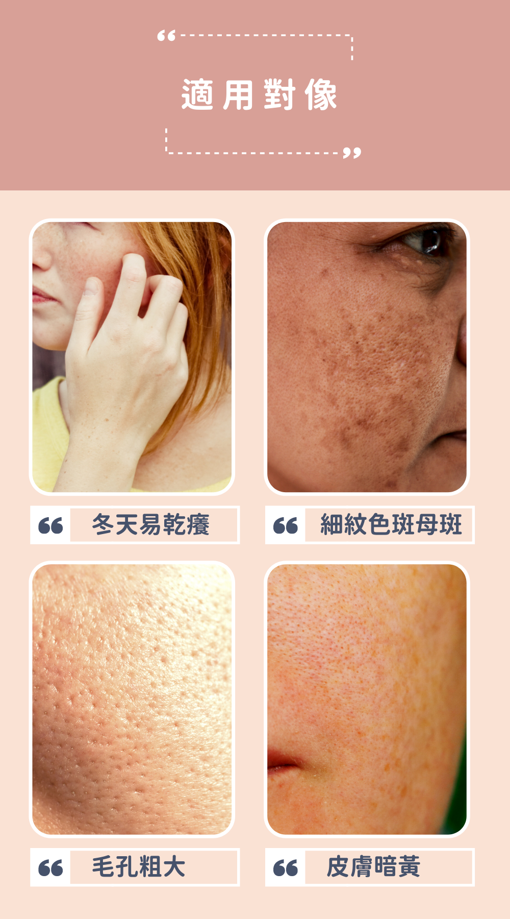 - 因個人膚質膚況、敏度與過敏源均不同,使用前,請先於耳際或肌膚局部測試數日。