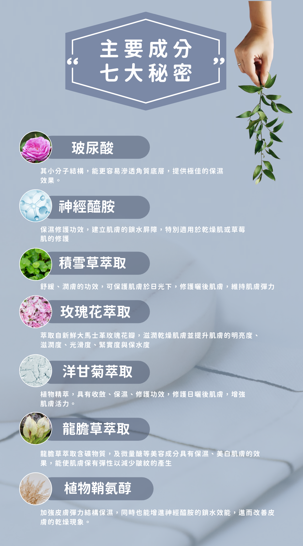 - 去離子水,保濕劑,三甲基甘胺酸,玫瑰水,己二醇,水解膠原胜肽,玻尿酸,甘草酸貳鉀,增稠劑,乳酸鈉,辛乙二醇,尿囊素,神經醯胺,洋甘菊萃取,蘆薈萃取,甘草萃取,乙基維他命C,積雪草萃取,乳酸.